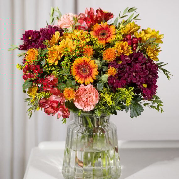 A stunning celebration of autumn’s rich palette featuring vibrant red Alstroemeria, cheerful orange Carnations and bold red Chrysanthemums. The golden Chrysanthemums and bright Germini add warmth to this seasonal display, while clusters of red Hypericum Berries provide texture and depth.