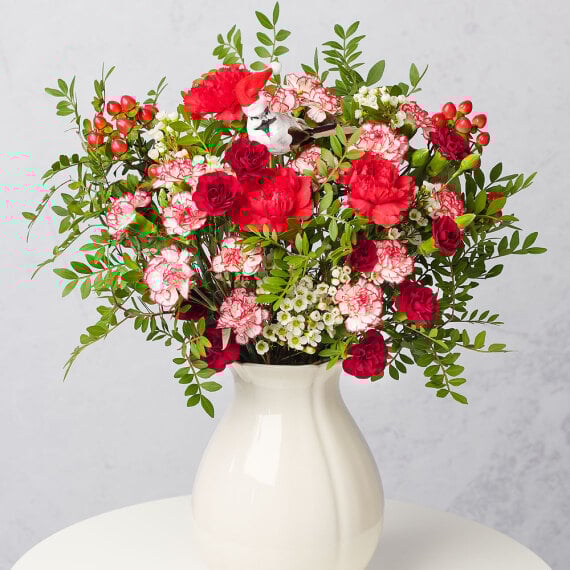 A Christmas selection of long-lasting Carnations and Spray Carnations in rich red and two-tone red and white with delicate white Waxflower. Finished with festive Hypericum Berries and a keepsake Christmas bird pick.