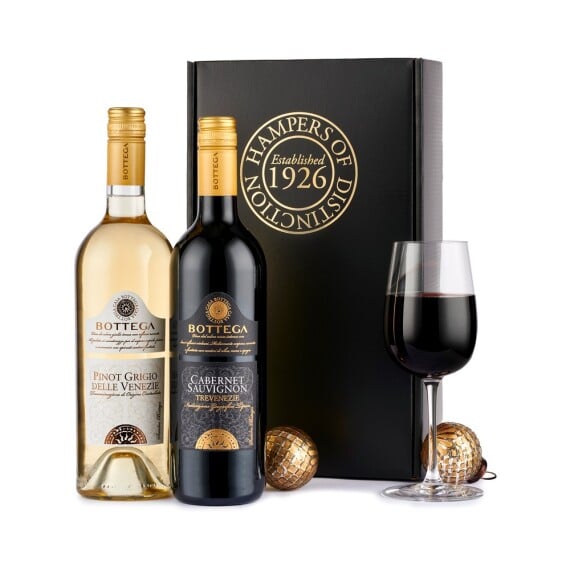 Savour Italian Cabernet Sauvignon and Pinot Grigio in our sophisticated black gift box presentation for wine enthusiasts. Elegantly presented in premium black packaging, this classic Italian duo offers exceptional quality for those who appreciate fine wines. This hamper contains 2 items: Bottega Cabernet Sauvignon 75cl (Italy) Bottega Pinot Grigio 75cl (Italy) Packed in a black gift box.