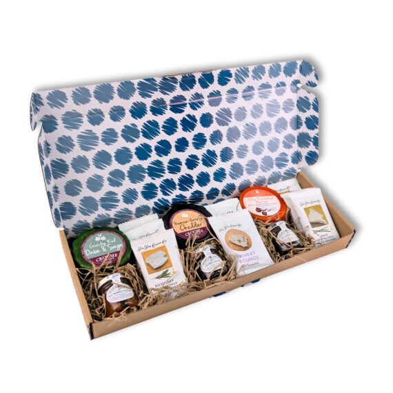 The perfect gift for any cheese lover – a letterbox-friendly parcel filled with artisan cheeses, crackers, and chutneys to create a mini cheeseboard moment anywhere, anytime. No cheeseboard is complete without chutney, so we’ve included three mini jars from Tiptree: a classic Chutney, fiery Hot Gooseberry Chutney, and exotic Hot Mango Chutney, adding the perfect finishing touch. This hamper contains 12 items: Croome Cheese Premium Vintage Cheddar 150g Croome Cheese Worcestershire Sauce & Shallots 150g Croome Cheese Crunchy Red Onion & Sage 150g Fine Cheese Co Chive & Extra Virgin Olive Oil Crackers 15g x2 Fine Cheese Co Rosemary & Extra Virgin Olive Oil Crackers 15g x2 Fine Cheese Co Extra Virgin Olive Oil & Sea Salt Cracker 15g x2 Fine Cheese Co English Bath Squares Portion Pack 15g Fine Cheese Co Charcoal Squares 15g Fine Cheese Co Wheat Rounds 18g Tiptree Chutney 38g Tiptree Hot Gooseberry Chutney 38g Tiptree Hot Mango Chutney 38g Packed in a Penny Post postal box.