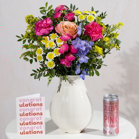 Celebrate their special achievement with this vibrant bouquet featuring a delightful mix of colourful blooms. A peach Rose takes centre stage alongside hot pink Carnations, cheerful Chrysanthemums and striking blue Delphinium. Accompanied by a can of pink lemonade and a heartfelt A6 congratulations card.