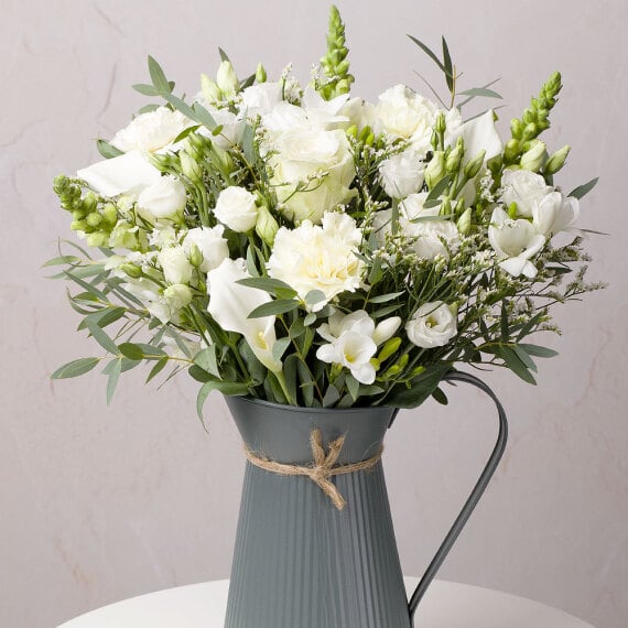 An exquisite arrangement featuring elegant white Calla Lilies gracefully surrounded by white snapdragon and a white Rose. Complemented by Freesias, Carnations with Eucalyptus greenery.